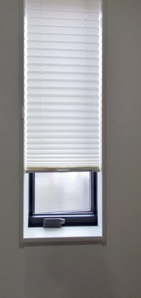 シルエットの透けるのを防ぐために小窓にもプリーツスクリーンを入れることにしました。