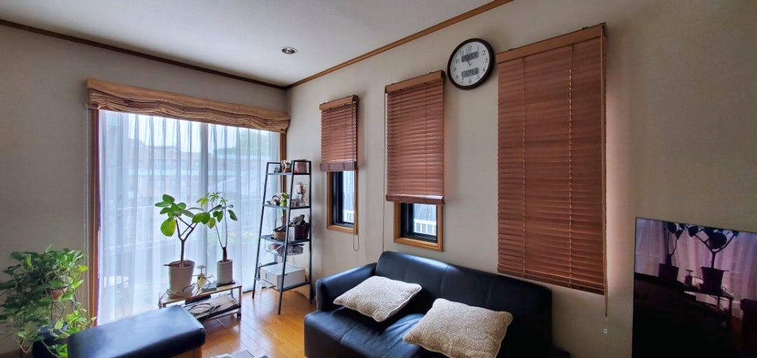 壁際にソファがあるので出幅の小さい35㎜スラットをチョイス、少しだけ壁との隙間を開け、丈もソファの背にかからないようにすることでぶつかったりソファを傷つけることがありません。