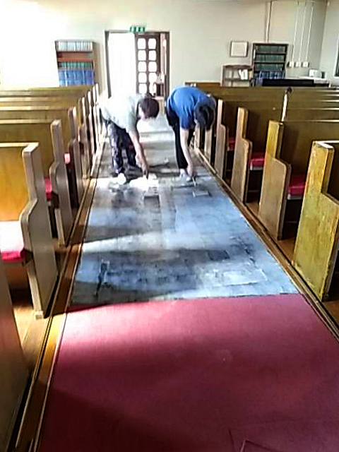 アンデレ教会は木造の建物、カーペットがズレてしまうことも考慮して専用の接着剤で張り付けていきます。
