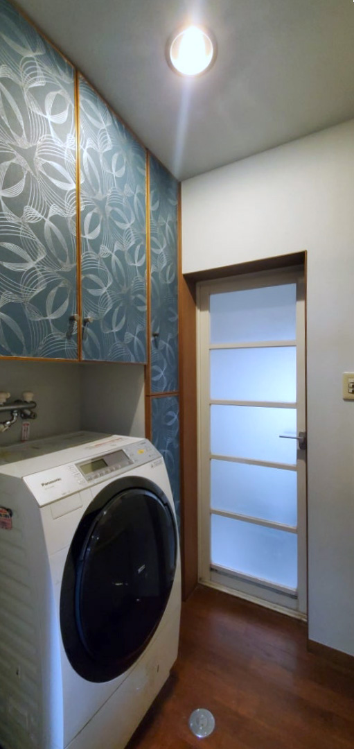 アクセント貼りするのは壁だけじゃない、洗面所では洗濯機上の吊戸棚の扉をアクセント貼りします。