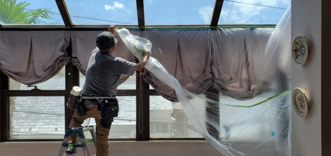 そのあとは垂直部分に設置しているバルーンシェードが汚れたり濡れたりしないように、床部とともに養生します。