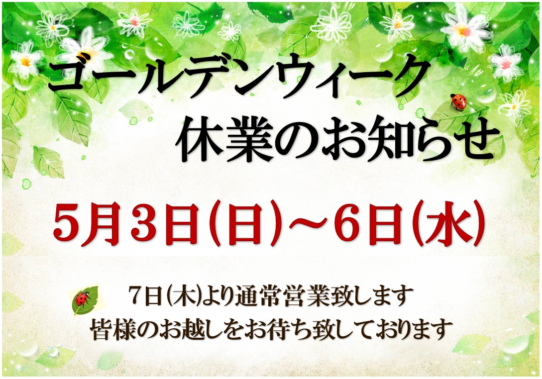 5月に入った連休はカレンダー通りお休みさせていただきます。