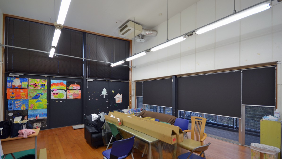 外デッキ側の窓にはロールスクリーンを設置、窓の開閉装置にぶつかってしまうため通常のロールスクリーンとは逆巻きにしました、こうすることで通常より5cmほど室内側に生地が降りてくるようになります。